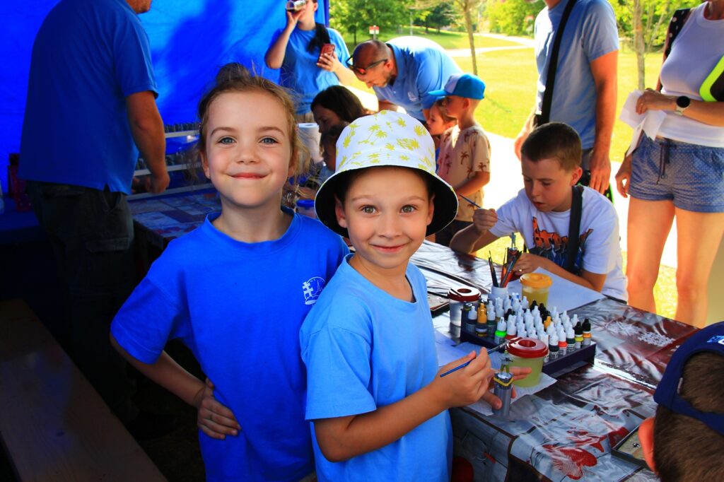 Keď sme prišli na miesto, mali sme pripravený veľký stan, stoly i malé „akváriá“ – rozumej vitríny na modely. Náš kamarát Ľuboš od vláčikov nám ešte požičal dve perfektné rozkladacie vitríny, takže sme všetky zaplnili modelmi, rozložili farby, štetce a figúrky a čakali na prvé deti.