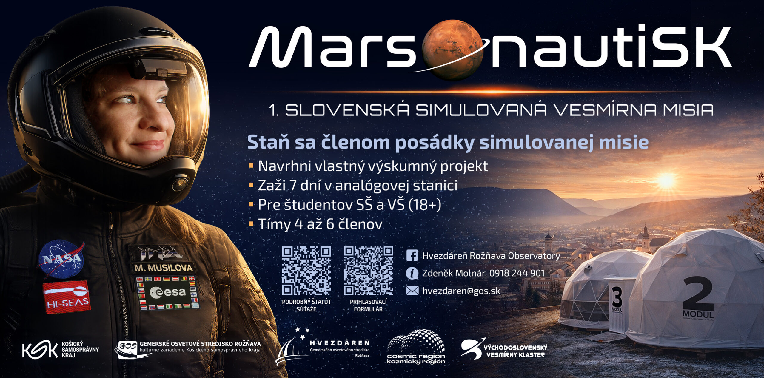 Košický samosprávny kraj a Gemerské osvetové stredisko preto vyhlasujú historicky prvú súťaž MarsonautiSK – Prvá slovenská simulovaná vesmírna misia, zameraná na výber posádky pre simulovanú vesmírnu misiu. Hľadajú sa študenti stredných a vysokých škôl. Očakáva sa, že zostavia posádku spolu s vypracovaním výskumno-popularizačného projektu, ktorý sa stane súčasťou misie. Partnerom projektu je Východoslovenský vesmírny klaster a súťaž aj samotná misia je financovaná Košickým samosprávnym krajom, pod záštitou predsedu Rastislava Trnku: „V našom kraji sme dosiahli celoslovenský míľnik, máme tu simulovanú vesmírnu misiu a teraz hľadáme analógových astronautov na realizáciu našej prvej simulovanej vesmírnej misie. Pre šikovných študentov je to šanca nenechať si veľké vesmírne plány iba na papieri, ale zrealizovať ich v praxi. Hoci sa nadšenie pre astronómiu, vedu a technológie bude odohrávať na zemi, vesmírna stanica je vernou podobizňou toho, čo zažívajú aj astronauti. Už meno garantky projektu hovorí za jeho kvalitu. Dr. Musilová je tou najskúsenejšou odborníčkou, ktorá priťahuje nielen odborníkov, ale aj nadšencov hviezd,“ doplnil župan.