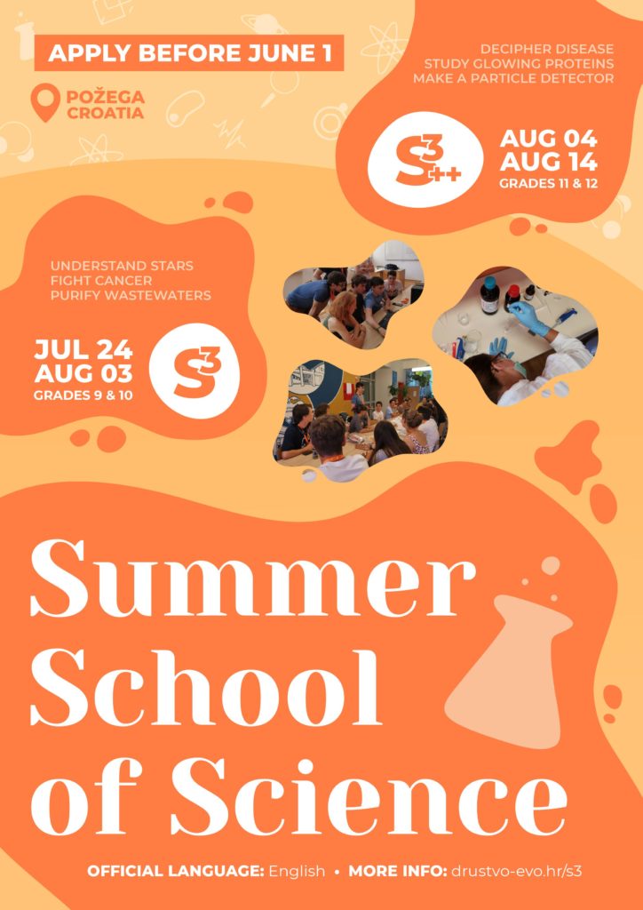 Letná škola pre žiakov stredných škôl sa uskutoční v Chorvátskej Požege v dvoch termínoch: od 24.7. do 3.8. a od 4.8. do 14.8. 2022. Žiaci z rôznych krajín sveta pracujú na vedeckých projektoch v skupinách pod dohľadom doktorantov a výskumníkov.